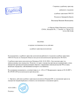 Примерный образец заполнения жалобы на судебного пристава в 2023 году, это формат бумажного обращения, если вы хотите получить ответ быстро и гарантировано подайте запрос приставу в электронном виде онлайн!